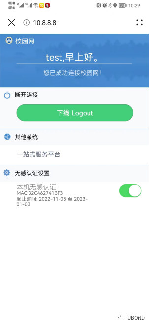 认证成功后系统会自动关联该设备无感认证,无感认证默认有效期30天,有效期内只要联网产生流量就会自动触发认证。如需下线某个设备,需登录自助服务在“在线设备”中先取消无感认证,再下线。否则只要有流量产生,就能反复触发无感认证重新上线。